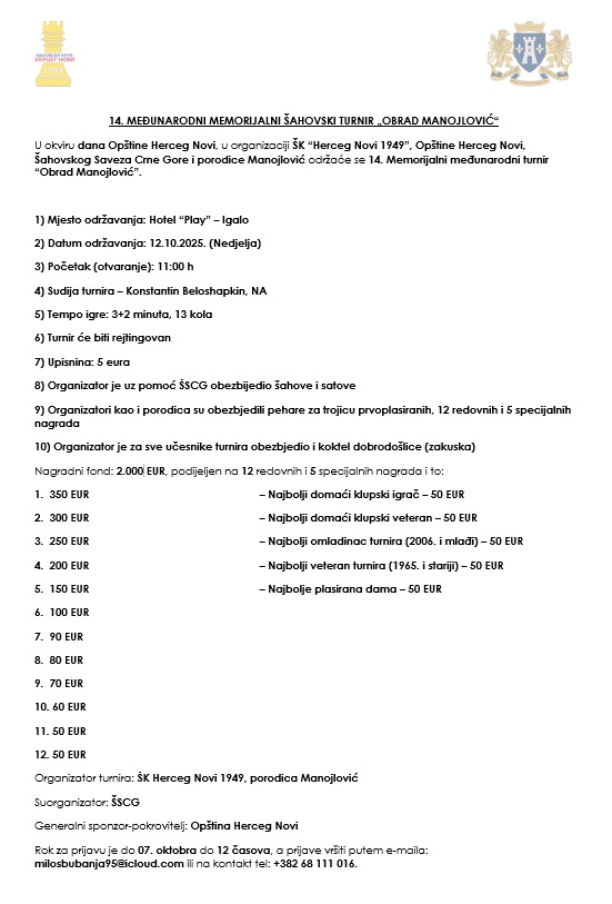 U okviru dana Opštine Herceg Novi, u organizaciji ŠK “Herceg Novi 1949”, Opštine Herceg Novi, Šahovskog Saveza Crne Gore i porodice Manojlović održaće se 14. Memorijalni međunarodni turnir “Obrad Manojlović”.
